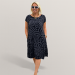 Douce, fluide et respirante, cette Robe d’Été à Motif Abstrait Bleu est l’alliée idéale des journées ensoleillées. Sa coupe ample assure une liberté de mouvement incomparable, tandis que son imprimé graphique bleu hypnotique apporte une touche moderne et originale. Facile à porter, elle se glisse aussi bien avec des sandales plates pour une balade décontractée qu’avec des accessoires chics pour une sortie estivale. Son tissu agréable et son design intemporel en font un indispensable de la garde-robe d’été.