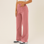 Los botones especiales añaden ese pequeño toque que marca la diferencia, transformando estos pantalones elásticos de cintura alta en un básico chic sin renunciar a la comodidad.
